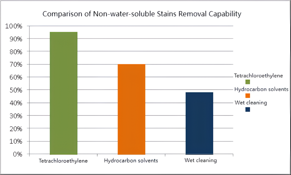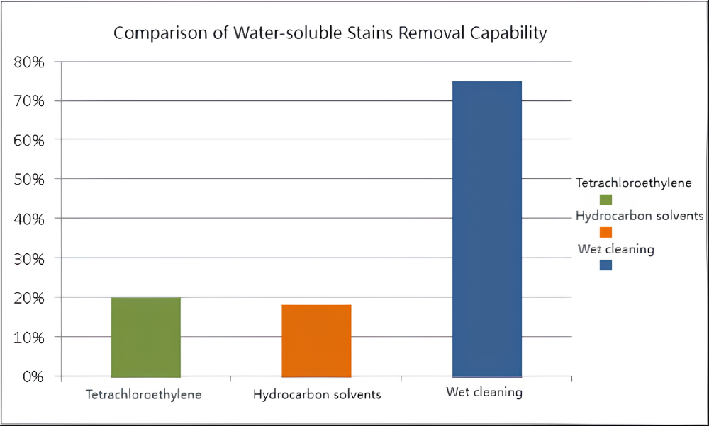 A limpeza úmida tem a maior capacidade de remover manchas solúveis em água, que pode chegar a 75%, seguida pelos solventes de tetracloroetileno e hidrocarbonetos.